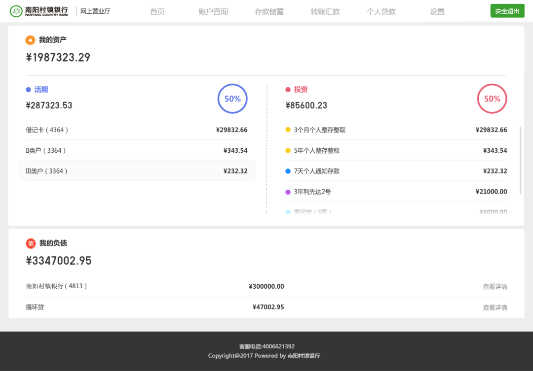 從首頁(yè)的“總資產(chǎn)”快捷入口可進(jìn)入資產(chǎn)頁(yè),本頁(yè)面將您的資產(chǎn)進(jìn)行了匯總,包含了在我行的活期資產(chǎn),存款投資資產(chǎn),以及負(fù)債信息等,布局合理,展示清晰明了。